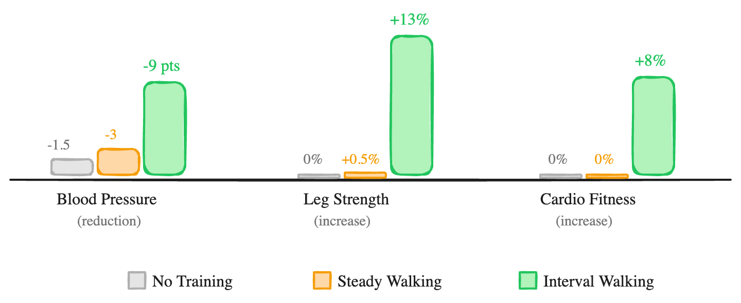 The difference between the steady walkers and the interval walkers was significant. The interval group developed noticeably stronger legs, improved their cardiovascular fitness, and lowered their blood pressure. Men in the interval group dropped their blood pressure by about 10 points, women by about 8. The steady walkers? They barely moved the needle (Nemoto et al., 2007).